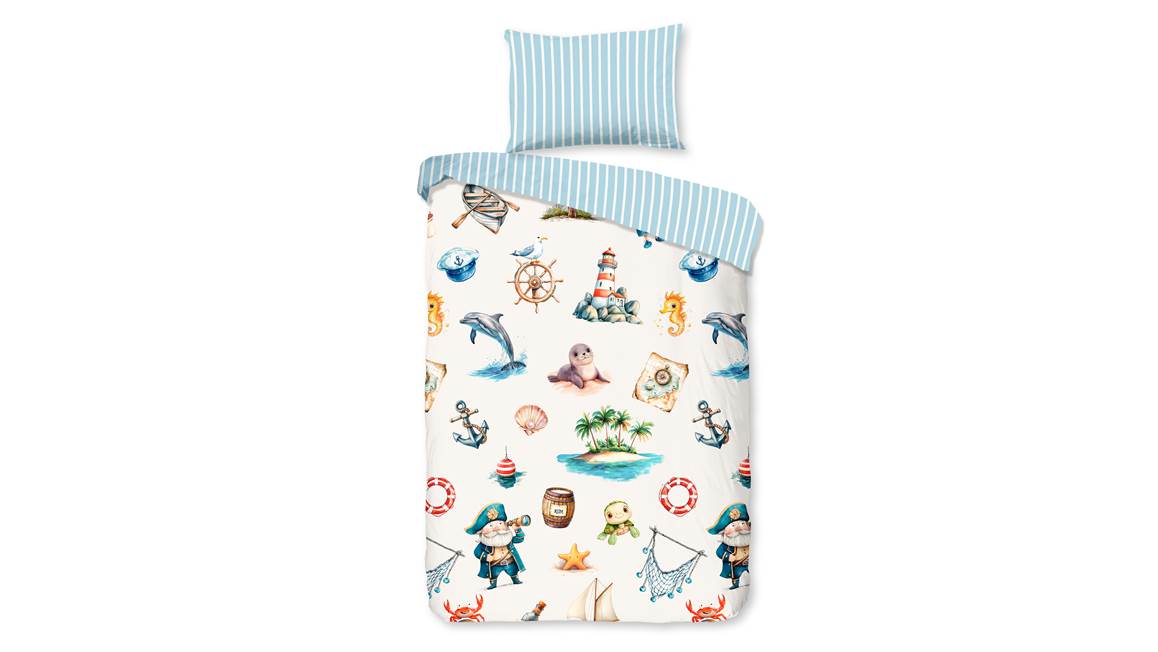 La housse de couette Capi de Good Morning fait souffler un vent de fraîcheur sur la déco de la chambre d’enfant. Les animaux de l’océan, bateaux, phares, filets de pêche et pirates plongent votre bambin dans un univers nautique plein de fantaisie. Côté dos, les rayures en blanc et bleu renforcent l’esprit bord de mer de cette parure de lit réversible (vendue avec la taie d’oreiller assortie en 60x70 cm).