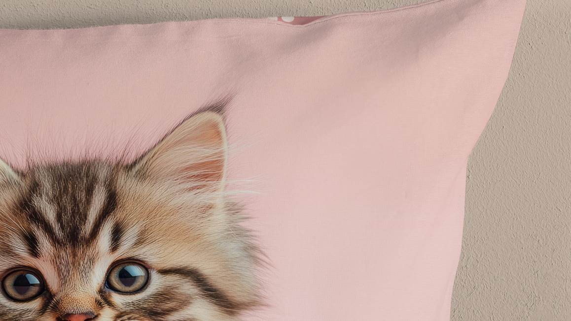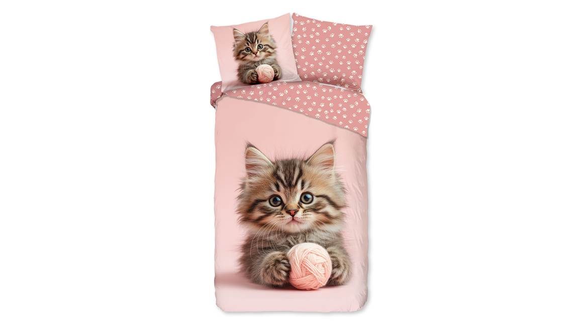 La housse de couette Chat de Good Morning se pare d’un chaton trop mignon qui joue avec une pelote de laine. Le dos uni rose est orné d’un motif répété avec des empreintes de pattes de chat. La parure de lit enfant réversible comporte une taie d’oreiller assortie mesurant 60x70 cm.
