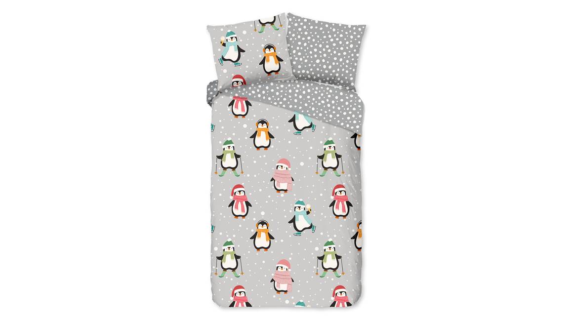 L’hiver s’invite dans la chambre d’enfant, grâce à la housse de couette en flanelle Liam de Good Morning au coloris Gris. Son imprimé ludique et plein de tendresse arbore des pingouins rigolos qui se sont emmitouflés pour aller jouer dans la neige. Le dos de cette parure de lit enfant réversible (qui comporte la taie d’oreiller assortie) est décoré de flocons de neige.