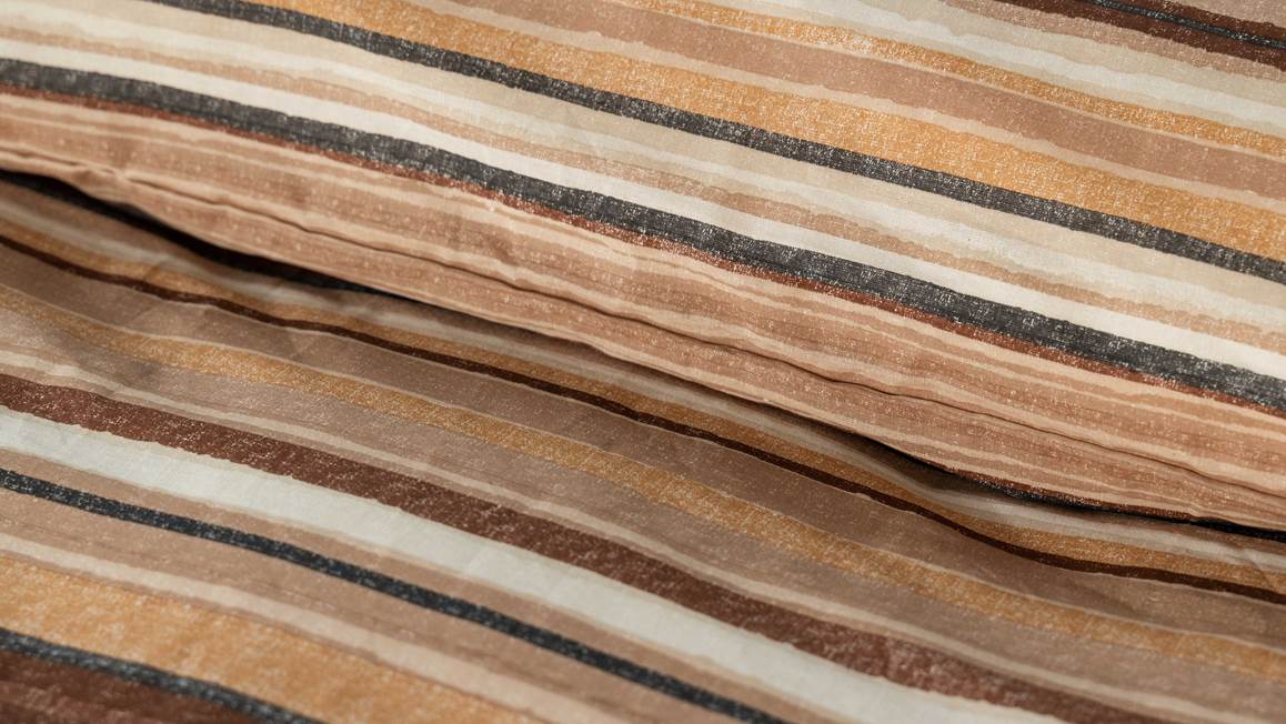La housse de couette Ito de Kayori se pare d’un motif à rayures en camaïeu de teintes terreuses. Les lignes irrégulières aux nuances naturelles accentuent son style chic et contemporain. Elles insufflent une ambiance apaisante et rassurante dans la chambre. Les taies d’oreiller assorties ont une taille standard de 60x70 cm.