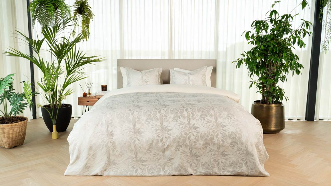La housse de couette Kaede de Kayori au coloris Gris argent apporte un twist chic et tendance à la chambre. Les couleurs douces et lumineuses de son motif floral tissé jacquard respirent l’ambiance douce et apaisante du style Japandi. La parure de lit (taies d’oreiller comprises) est finie d’un dos uni.