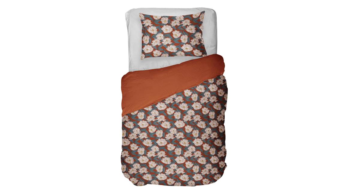 Esprit rétro chic pour la housse de couette Makoto de Kayori. Rehaussé d’un motif de vagues Seigaiha raffiné, son fond de couleur terracotta confère un côté ethnique au dessin floral en écru et bleu. La housse de couette réversible (dos uni) comprend les taies d’oreiller rectangulaires de 60x70 cm.