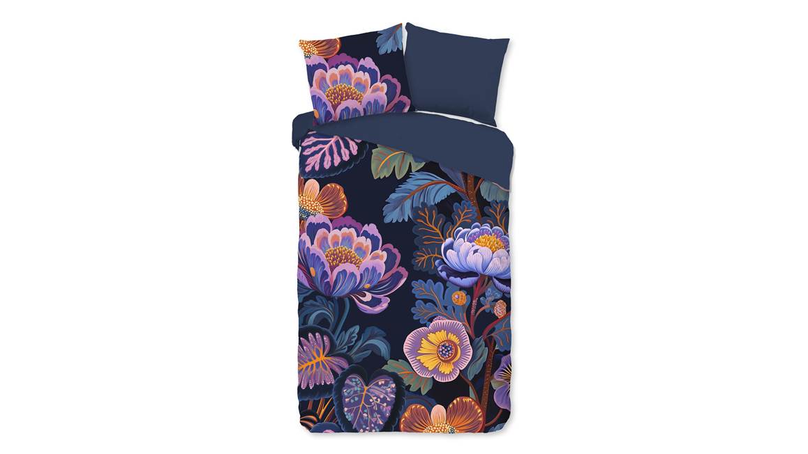 Ambiance Flower Power pour la housse de couette Sharira de Pure. Ornée de grandes fleurs fantaisie en camaïeu de violet avec des accents jaunes, cette parure de lit bleue réveillera votre chambre à coucher. Réversible, elle offre le choix entre un motif floral et un dos uni de couleur bleu foncé. Elles est vendue avec les taies d’oreiller assorties en 60x70 cm.